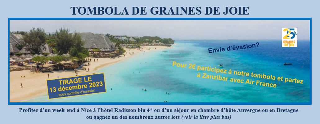Alors n'hésitez pas à nous contacter pour acheter des tickets, soit à l'unité, soit en carnet de 10 (prix du billet 2 €) nous vous les enverrons par mail ou par courrier. Vous pouvez passer votre commande par mail: contact@grainesdejoie.eu ou par téléphone 06 62 05 18 46 ou 09 73 66 98 62. Vous pouvez également acheter directement vos tickets ou carnets via Helloasso: J’ACHÈTE DES TICKETS OU CARNETS VIA HELLOASSO