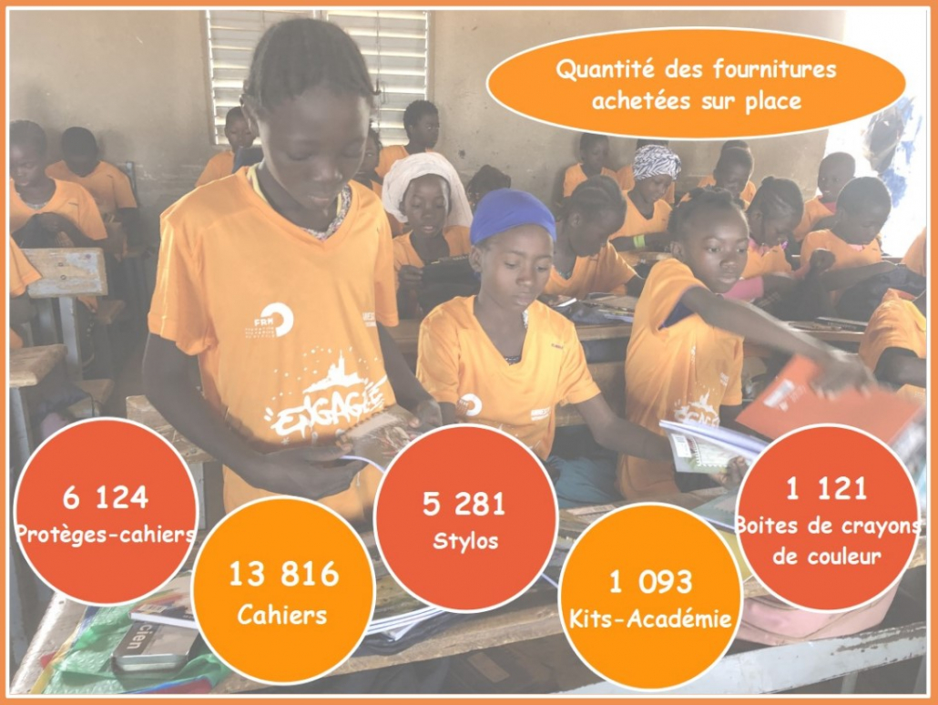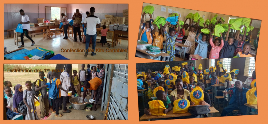 OPÉRATION « KITS CARTABLES »BILAN DE L'OPÉRATIONCette opération consiste à récolter des fonds pour donner à chaque élève le matériel pédagogique nécessaire. L'édition 2023 a remporté un vif succès ! Les 8 697€ récoltés ont permis de financer la rentrée de 1 767 élèves du primaire et du collège-lycée de Guigmtenga, (1 121 élèves au primaire et 646 élèves au collège/lycée). La mission ayant été annulée, l’équipe de Graines de Joie Burkina, a assuré l’achat des fournitures scolaires, la confection des kits cartables ainsi que sa distribution à chaque élève. La commande et la livraison de vivres pour les cantines a également été gérée directement sur place.